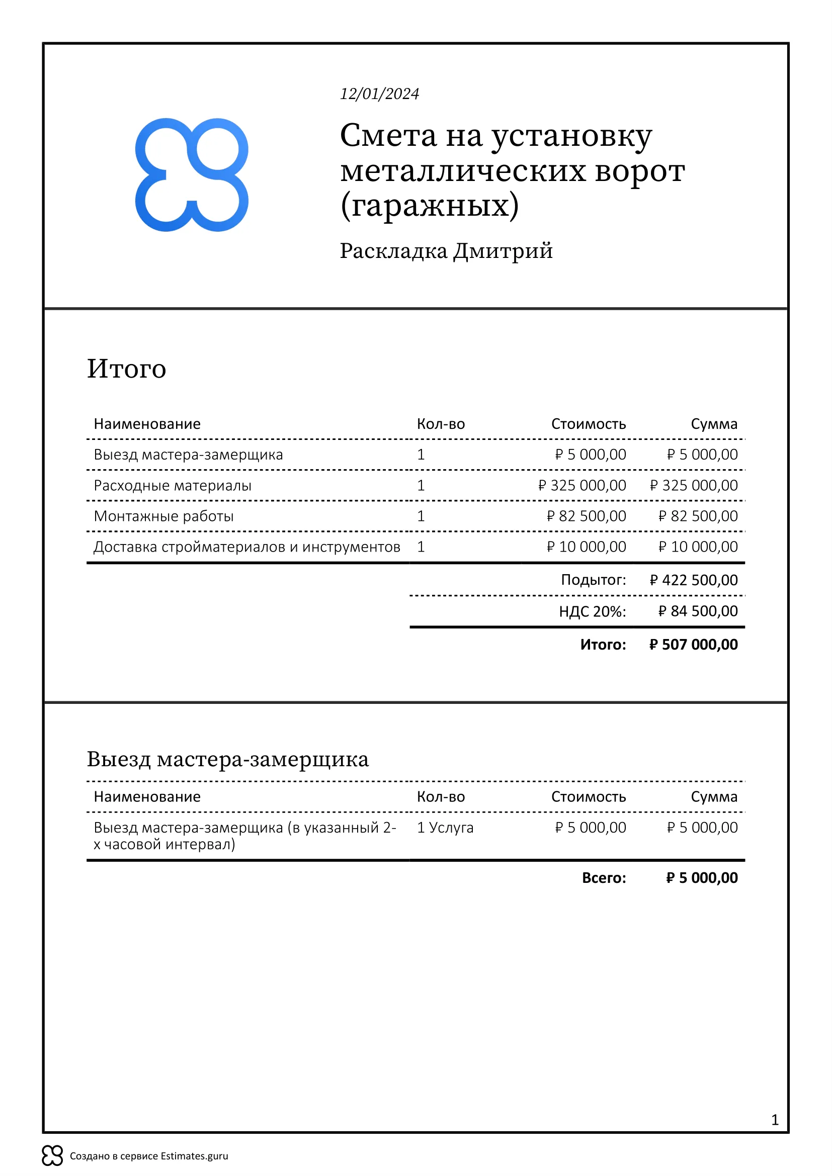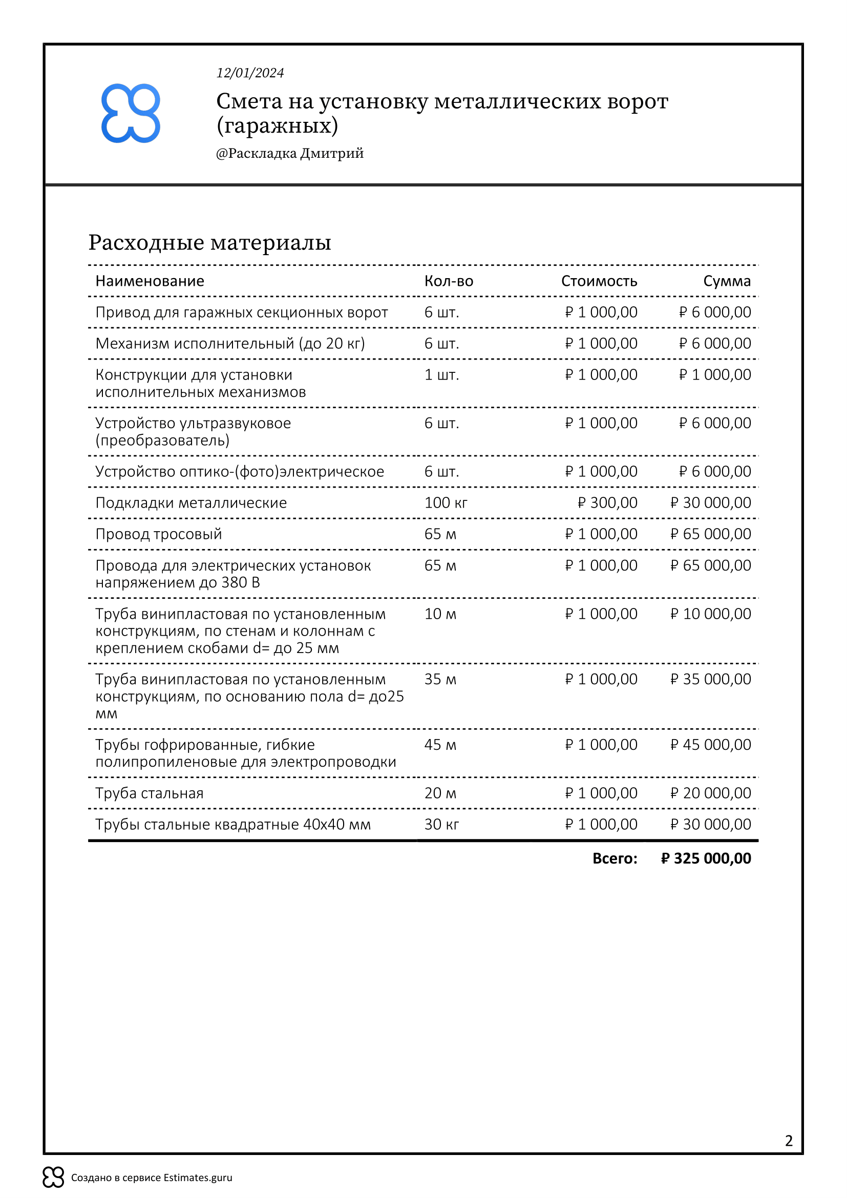 Смета на установку металлических ворот (гаражных) включает в себя все необходимые этапы и расходные материалы.