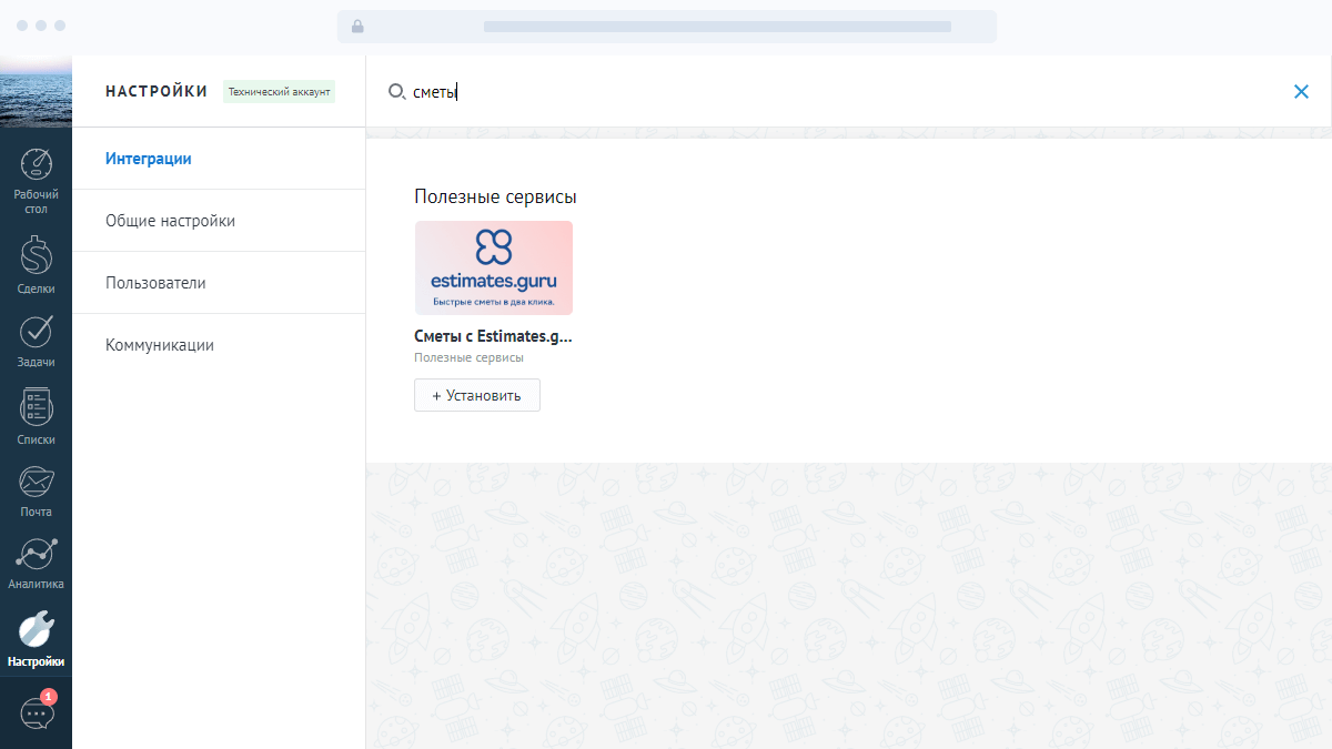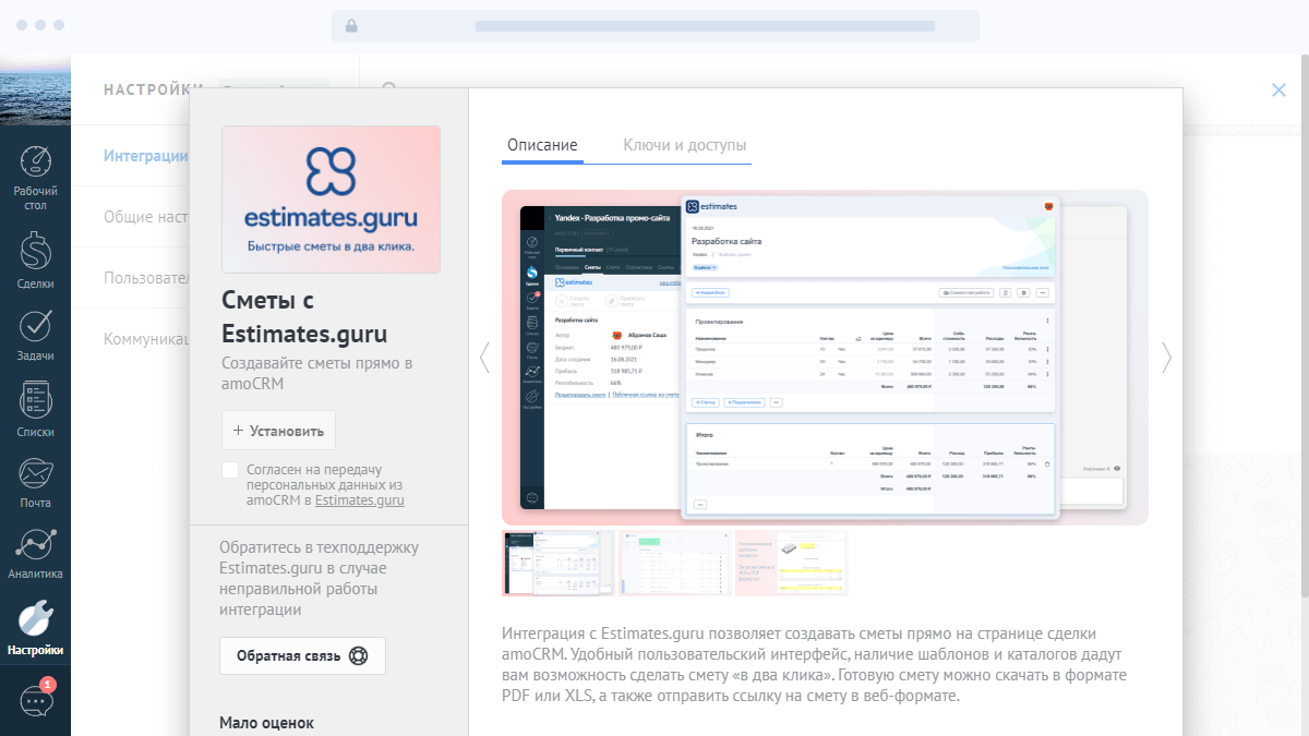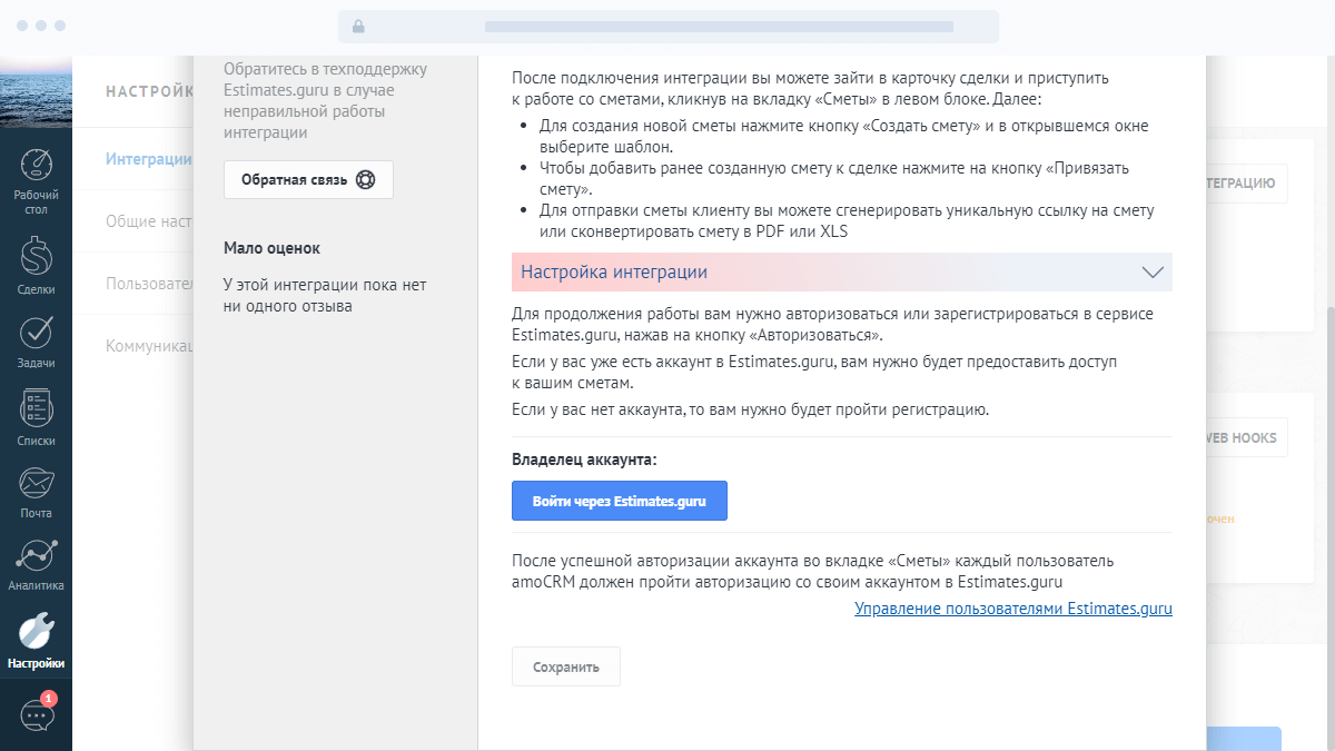Интеграция с Estimates.guru позволяет создавать сметы прямо на странице сделки amoCRM.