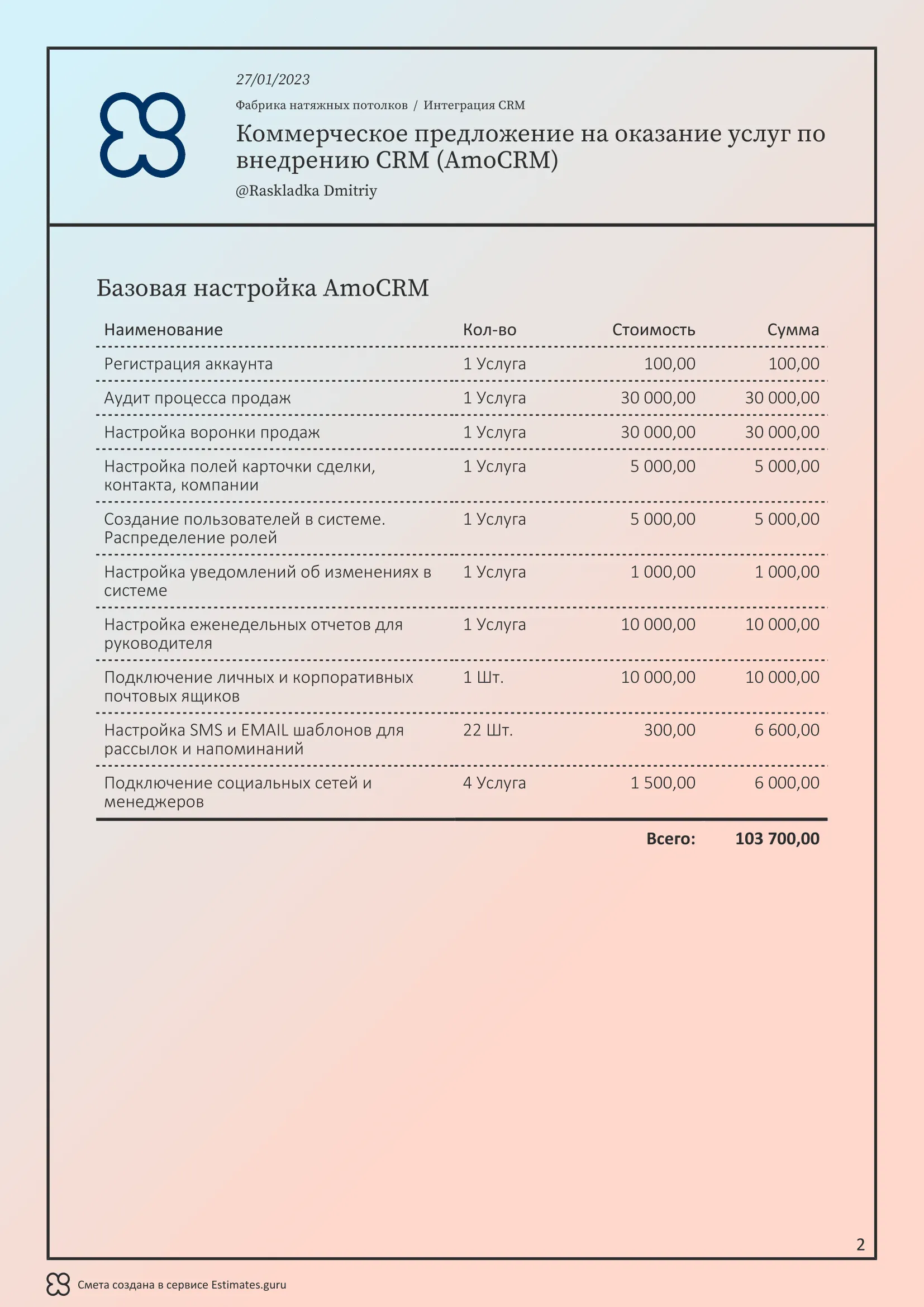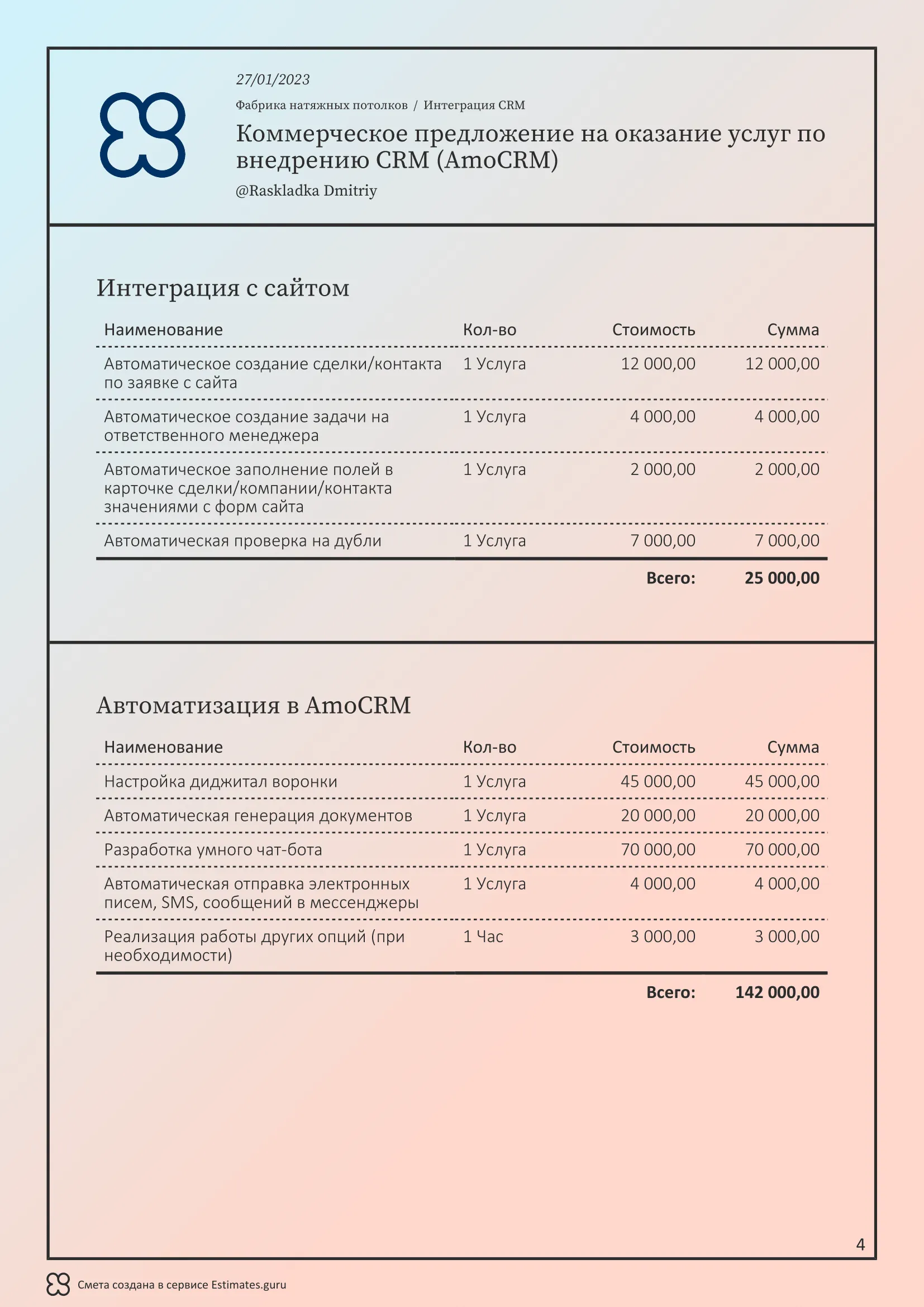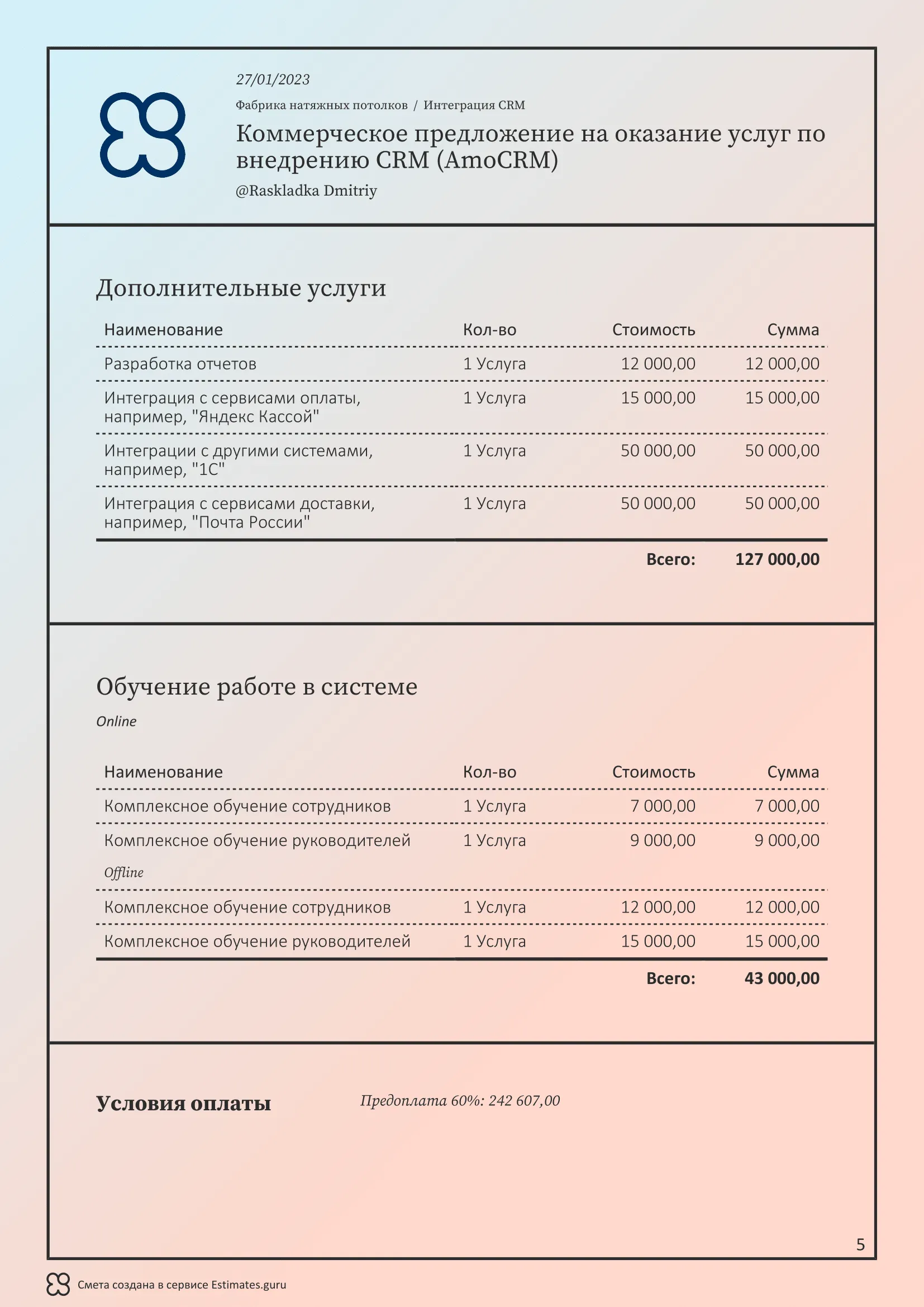 Да. У новых пользователей активируется бесплатный 14-дневный период. Зарегистрируйтесь в Estimates.guru и протестируйте сервис. Создайте любое коммерческое предложение на услуги, образец которого найдёте в личном кабинете.