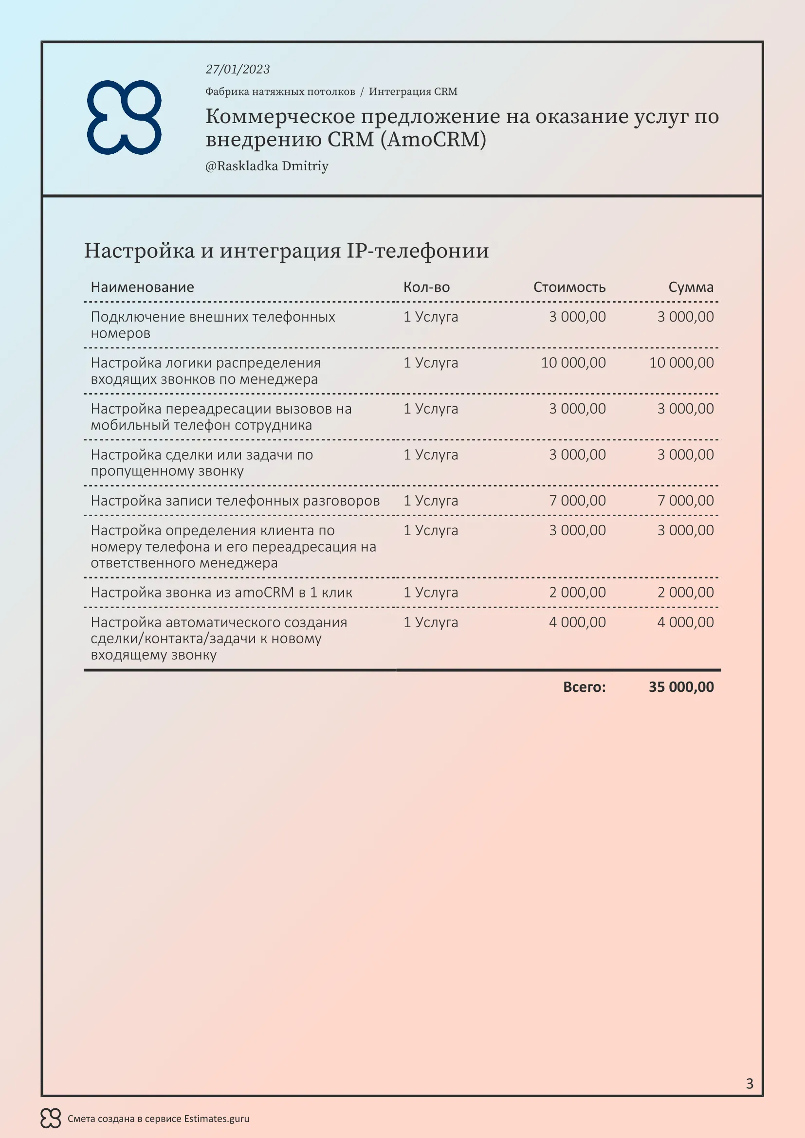 Вы может создать шаблоны коммерческих предложений и расчетов для своих менеджеров по продажам или выбрать и отредактировать готовые примеры доступные после регистрации.
