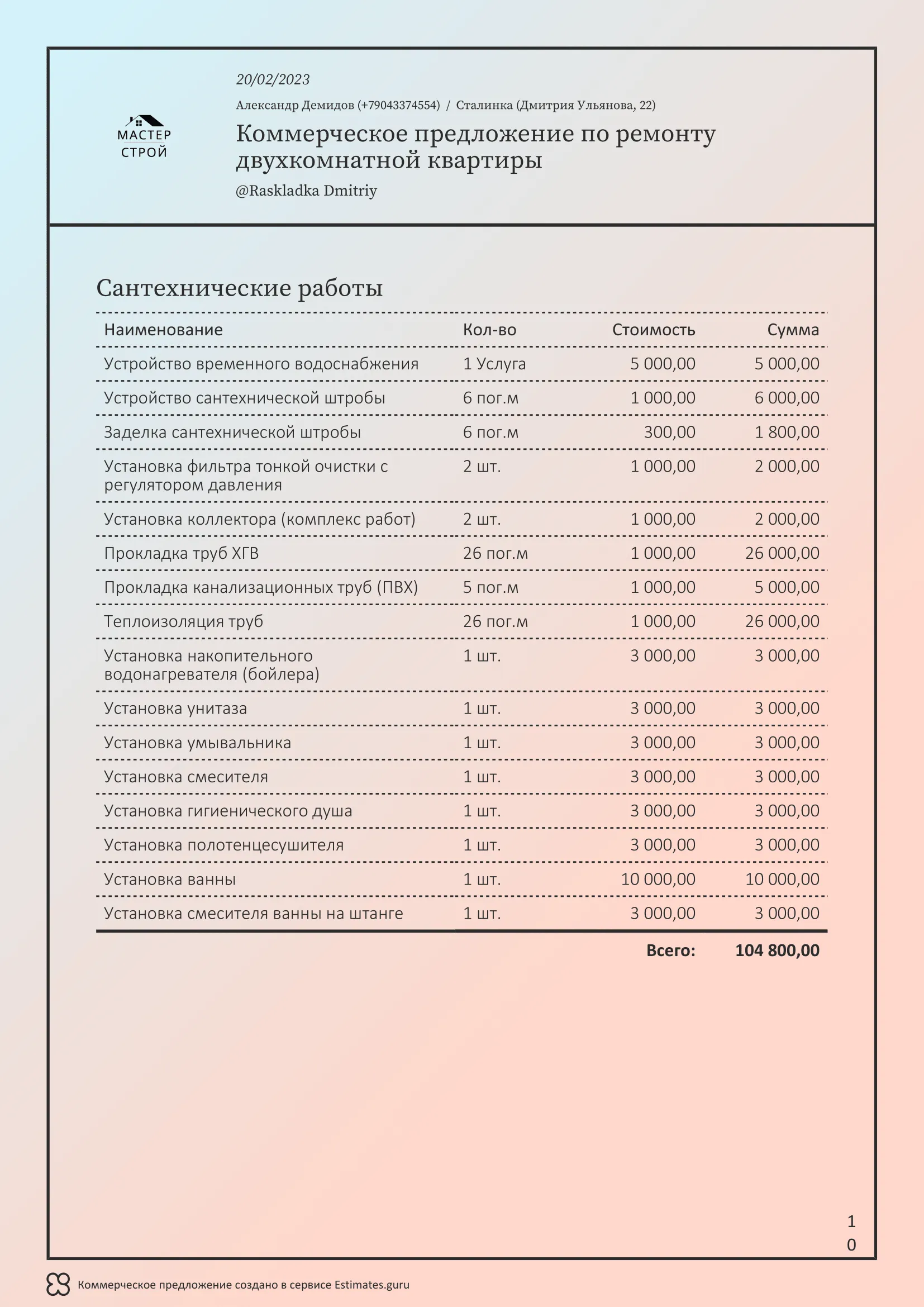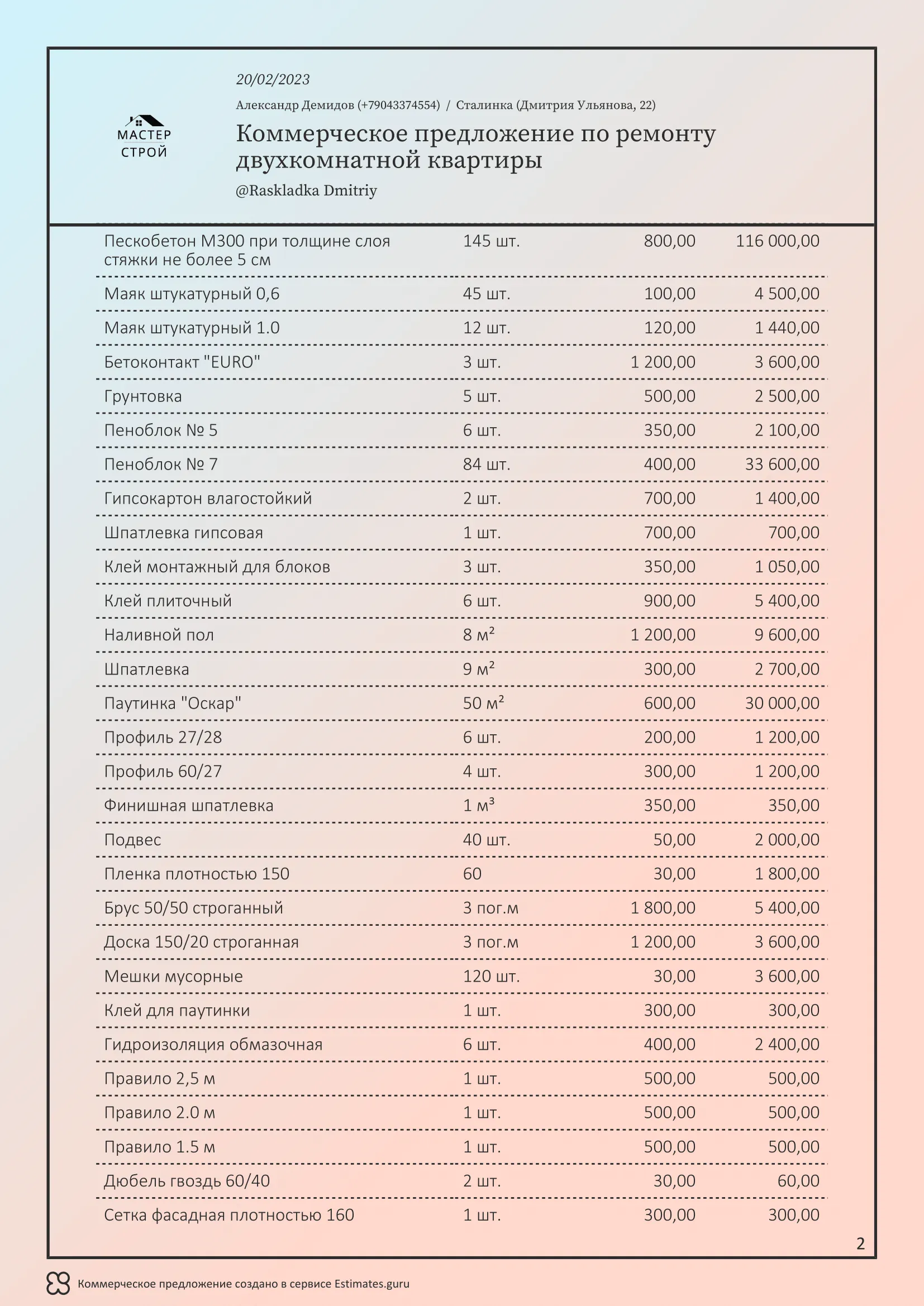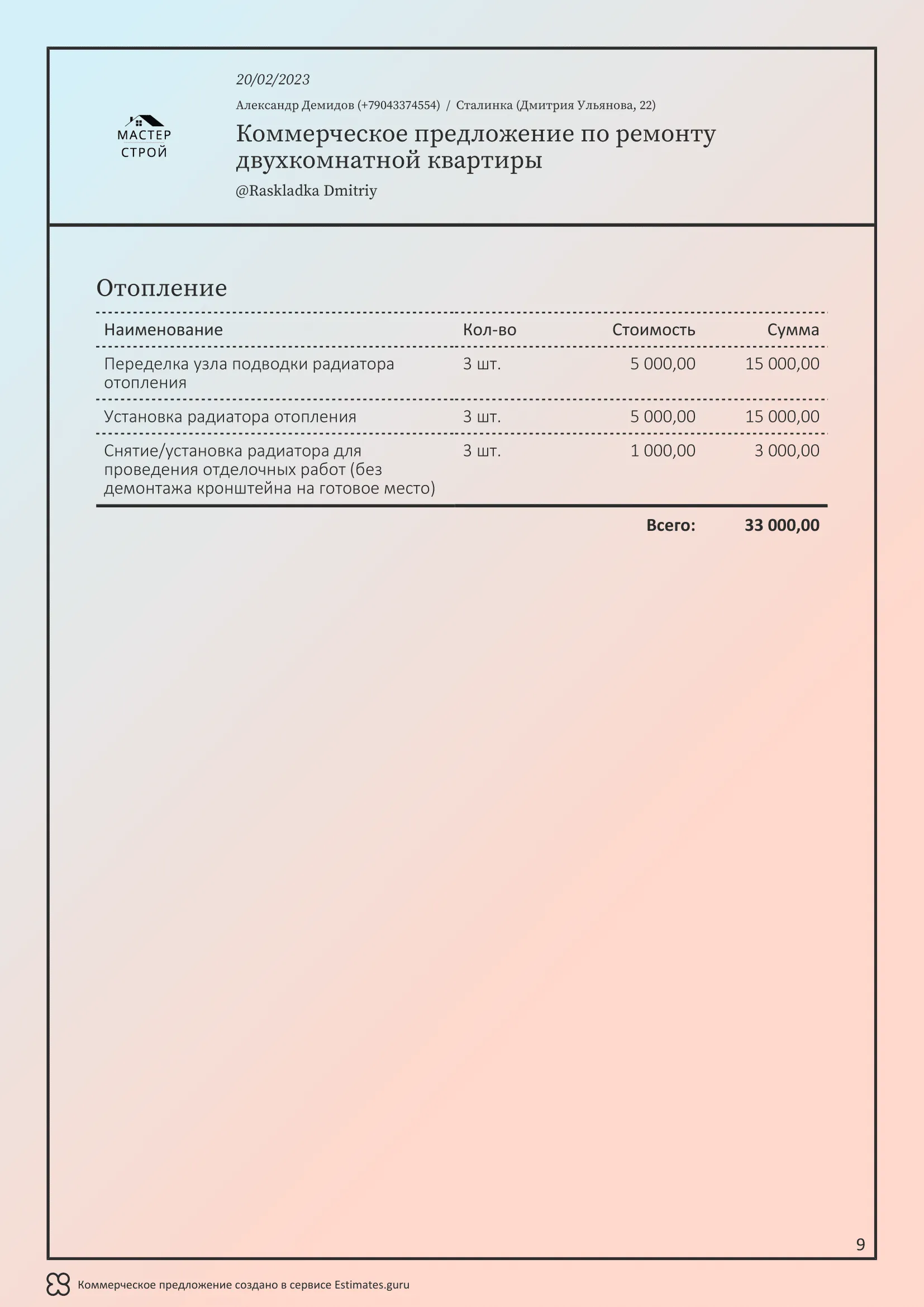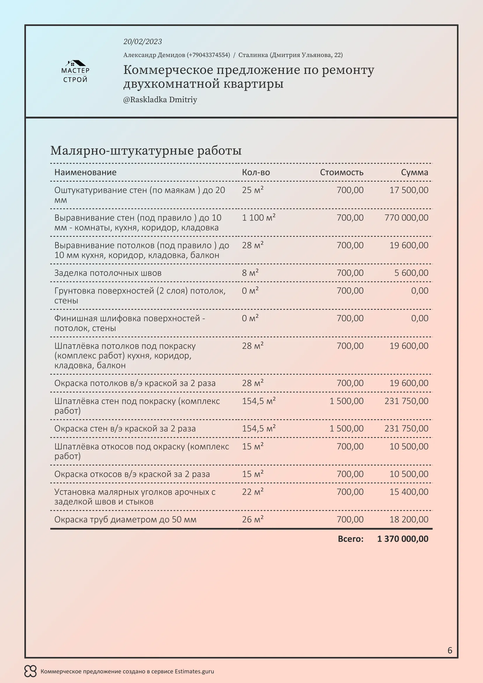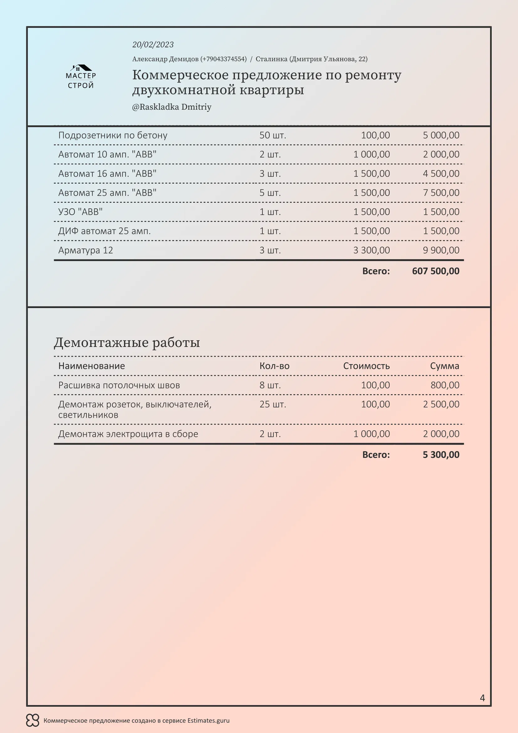 Мы создали сервис Estimates.guru, который позволяет самостоятельно создавать коммерческие предложения и расчеты на услуги ремонта. Наши клиенты выделяют множество преимуществ работы с нами, а именно: