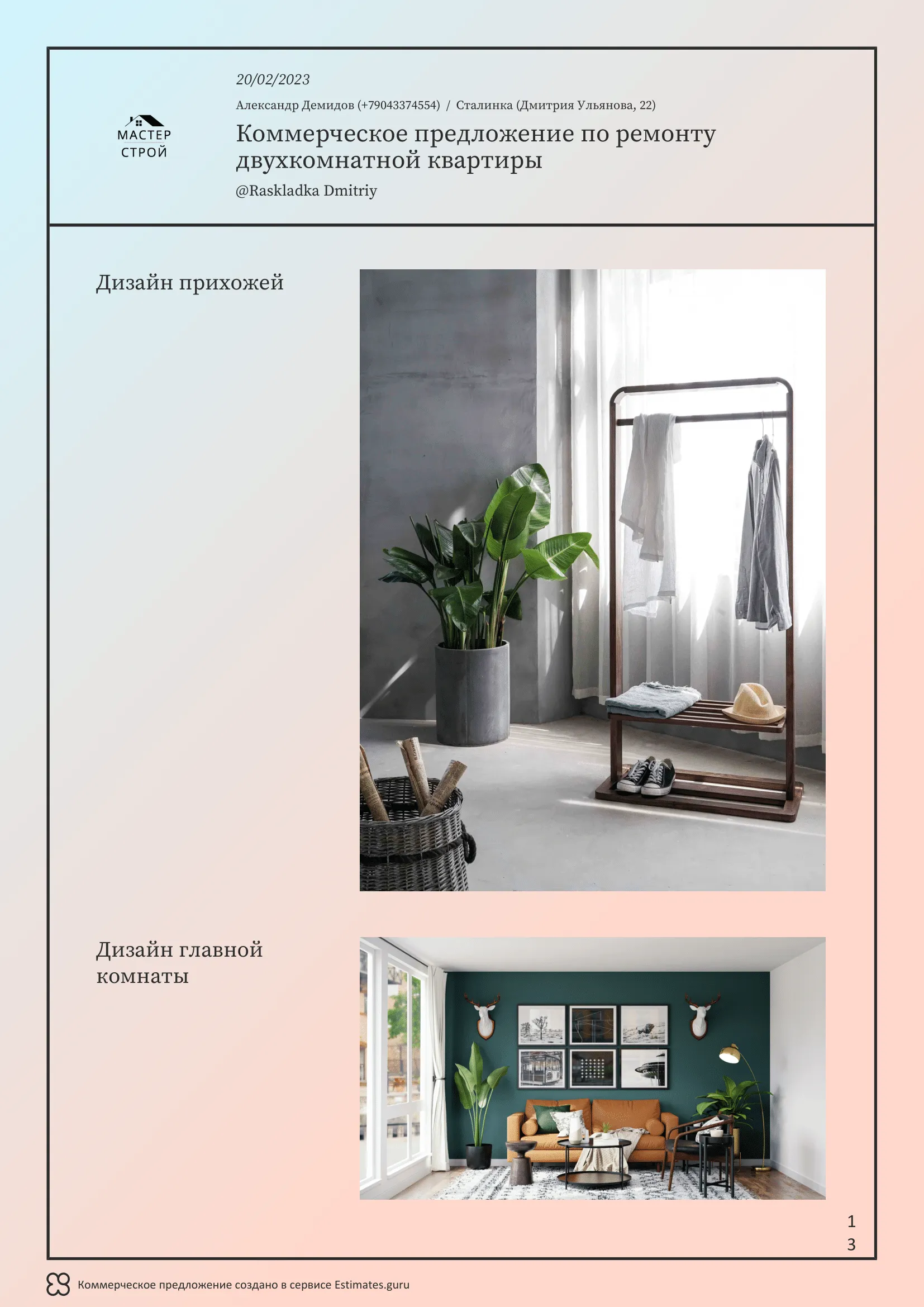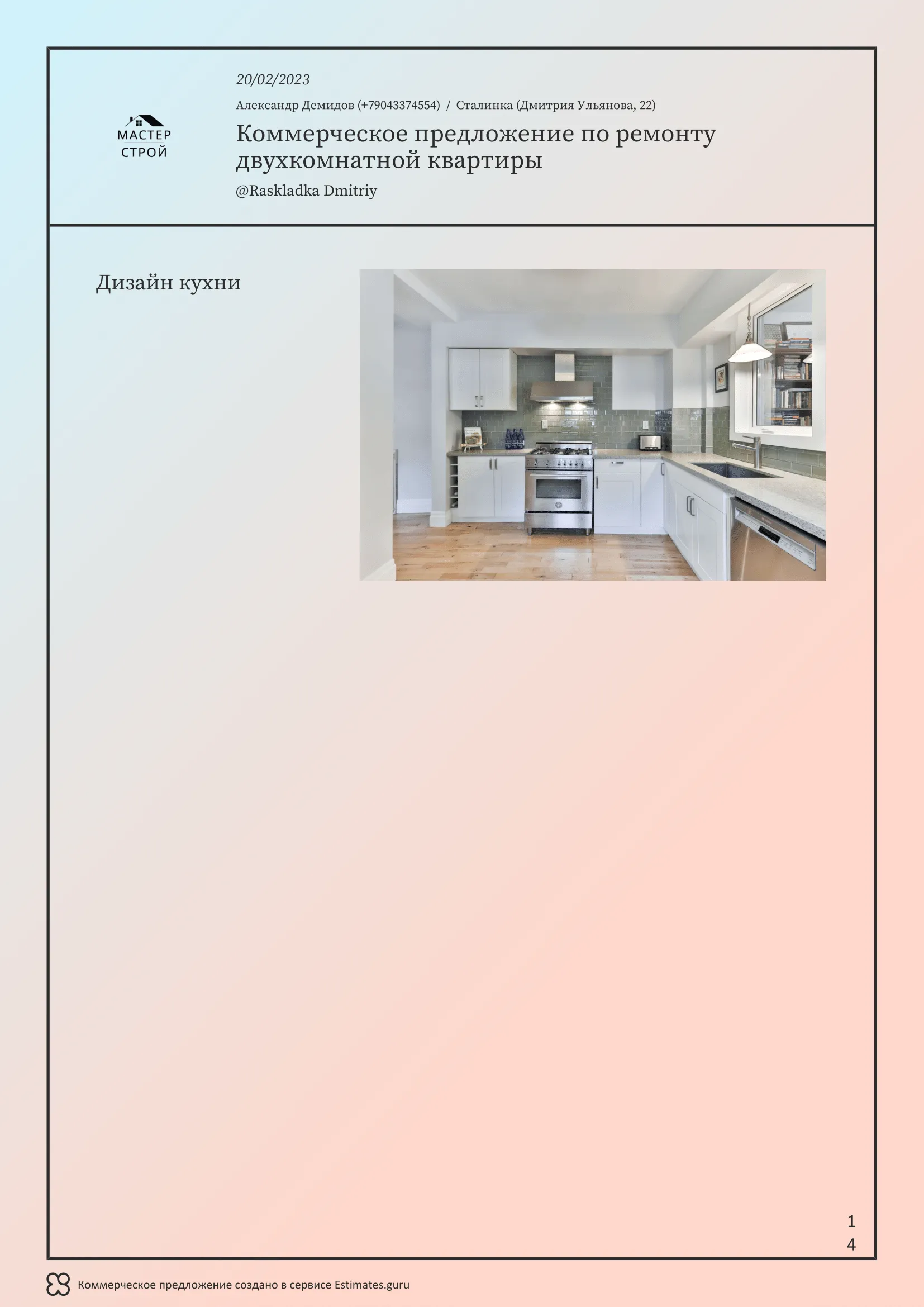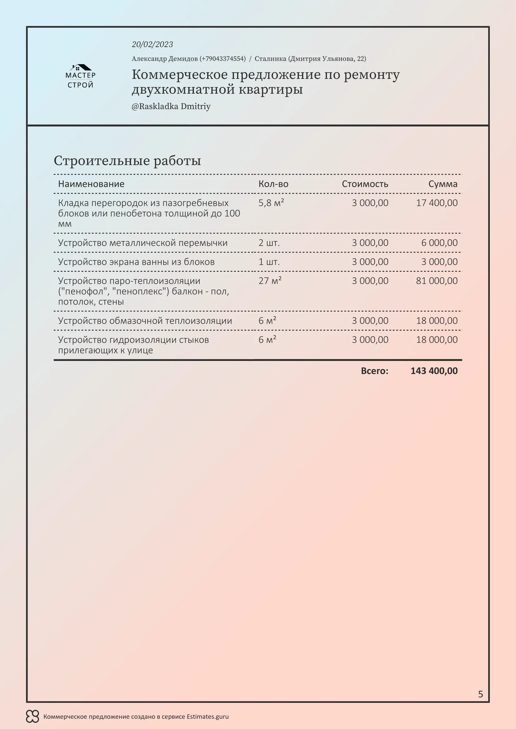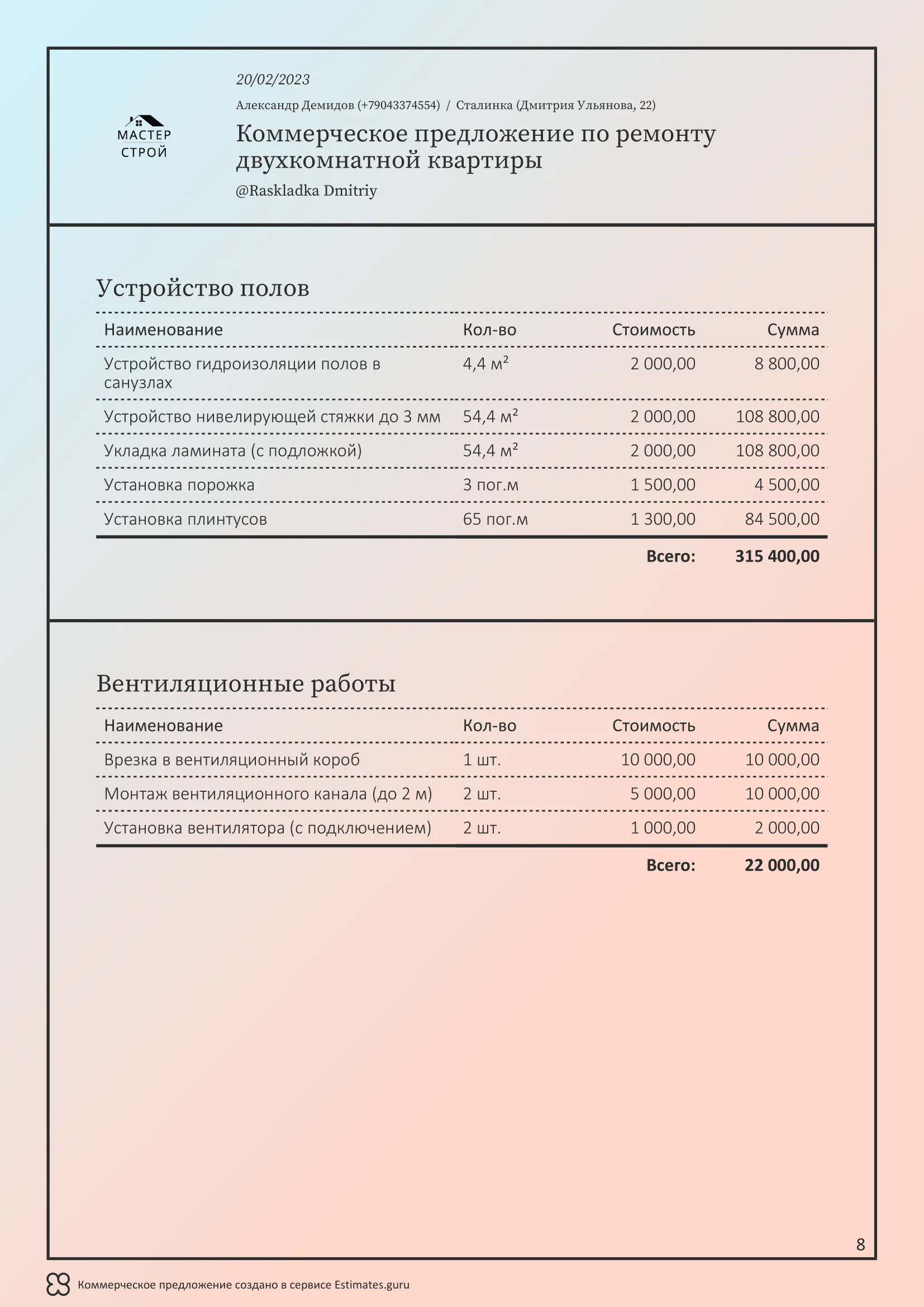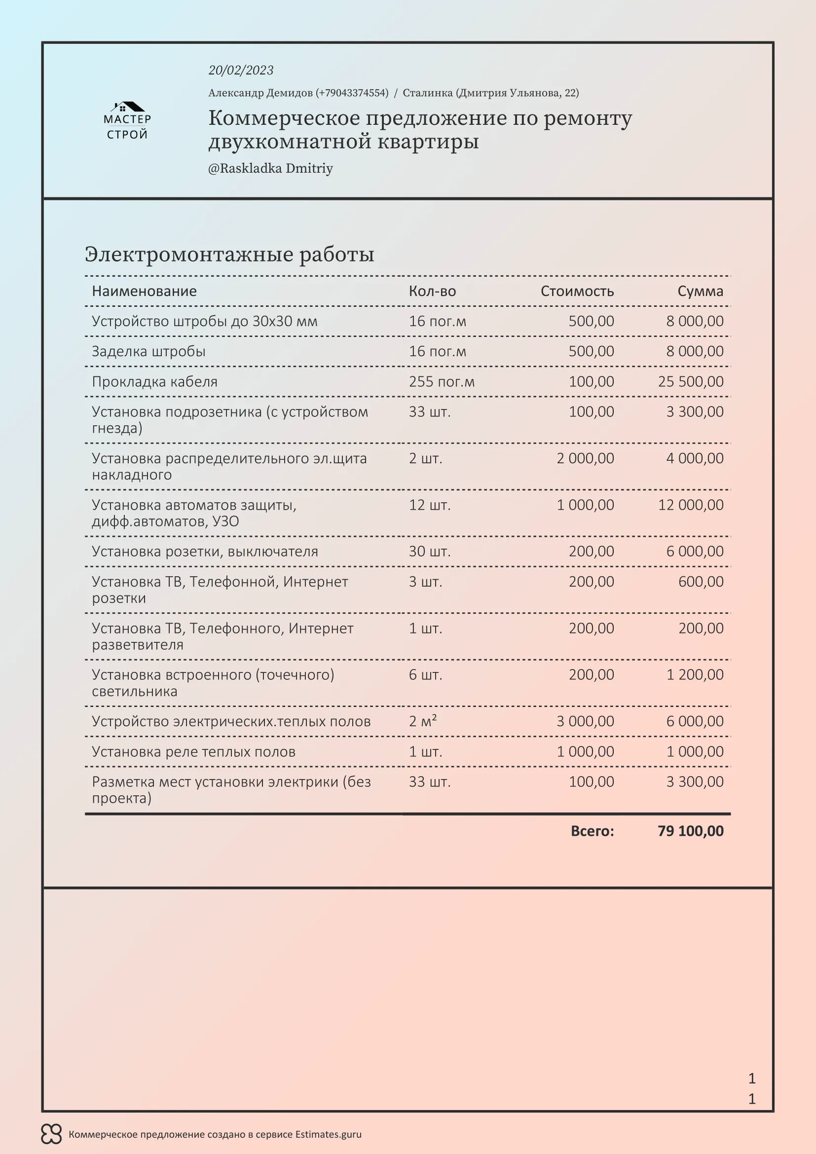 Мы создали сервис Estimates.guru, который позволяет самостоятельно создавать коммерческие предложения и расчеты на услуги ремонта. Наши клиенты выделяют множество преимуществ работы с нами, а именно: