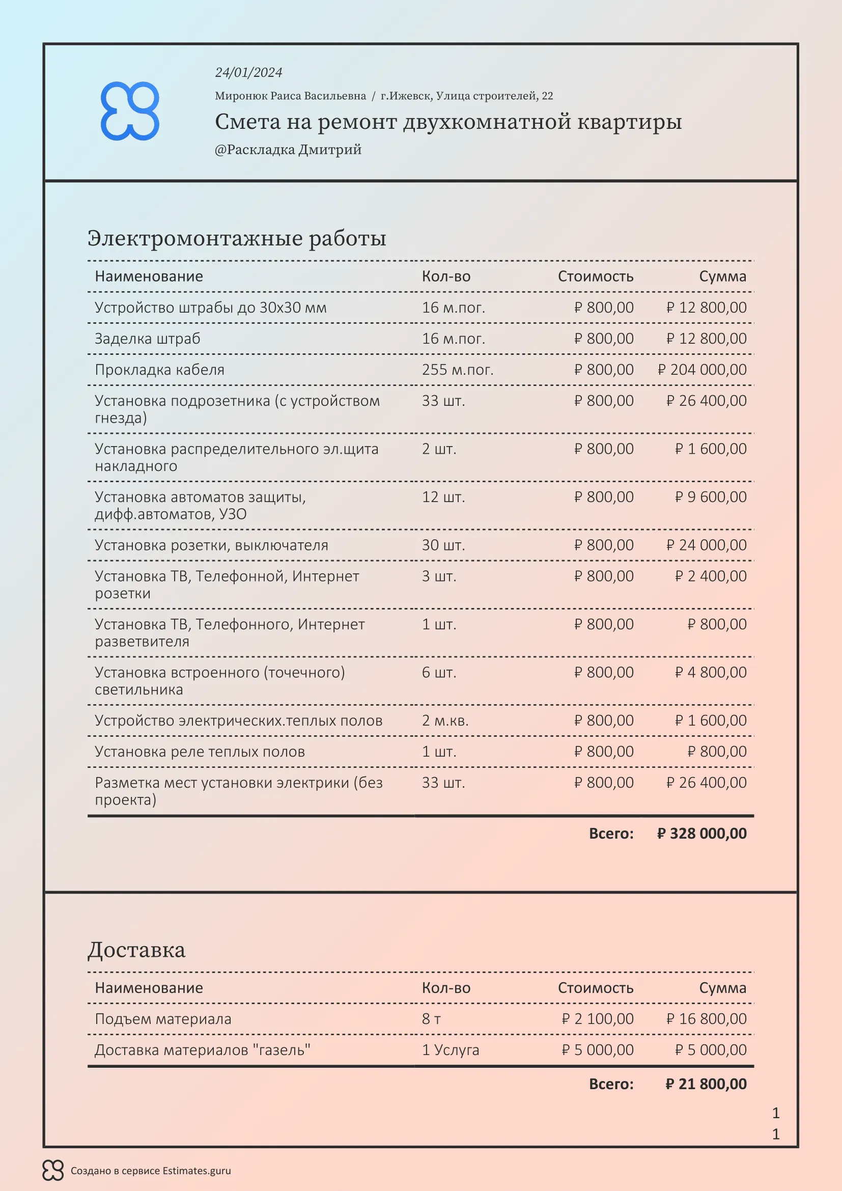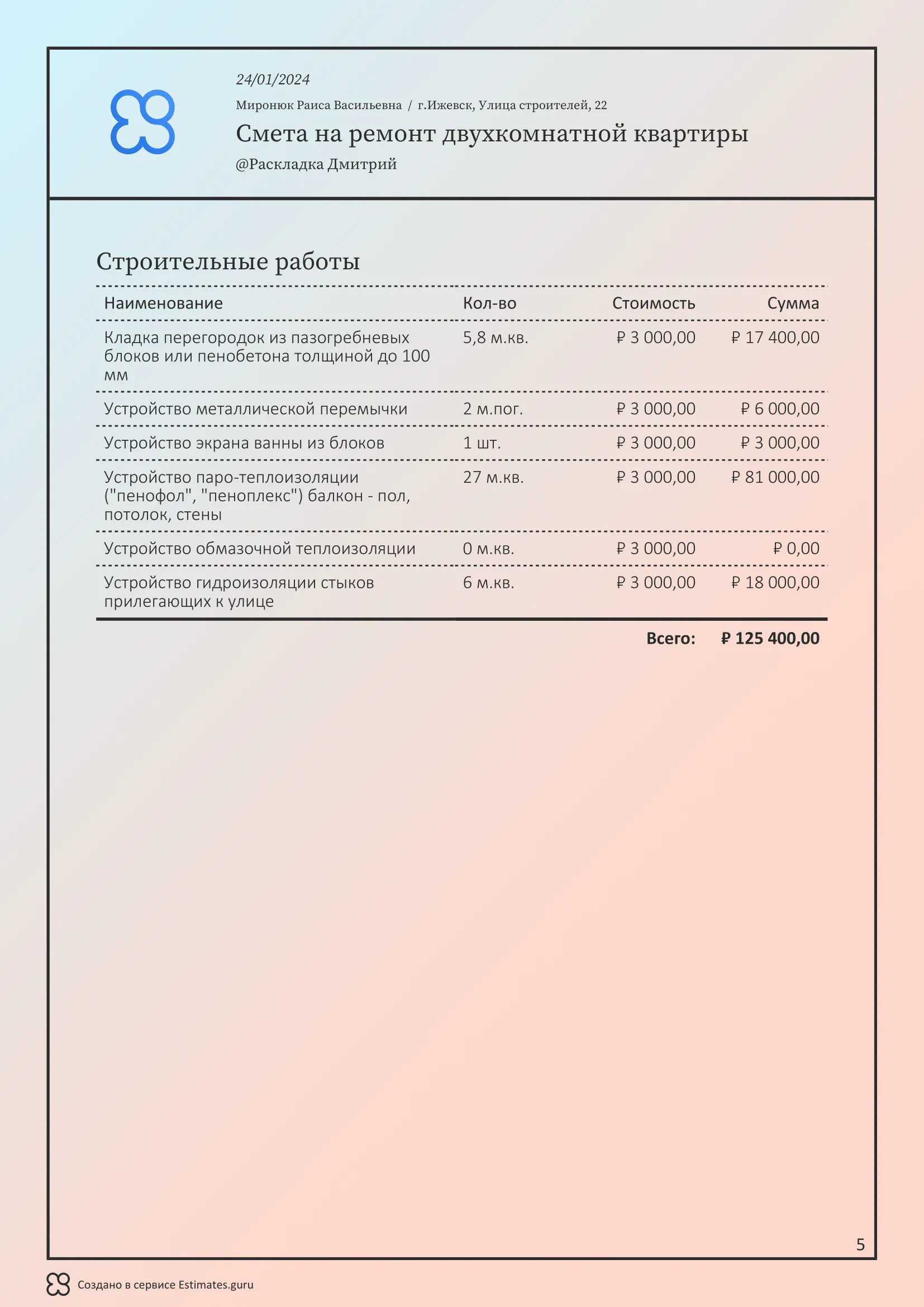 У шаблона гибкие настройки. Вы легко измените смету для своих целей. Загрузите в личный кабинет все материалы и услуги, укажите цены и отправьте клиенту готовый документ.