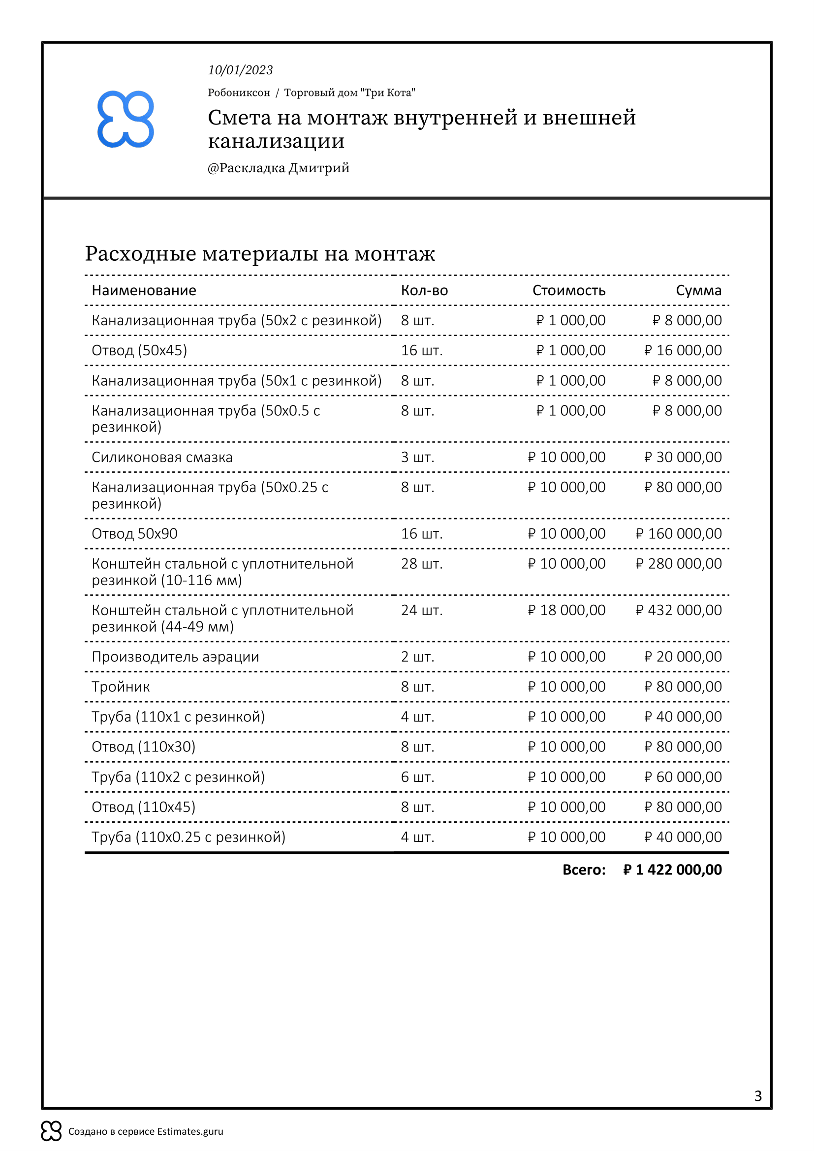 Смета на монтаж внутренней и внешней канализации включает в себя тестовые расценки, которые вы можете поменять на актуальные прямо в смете.