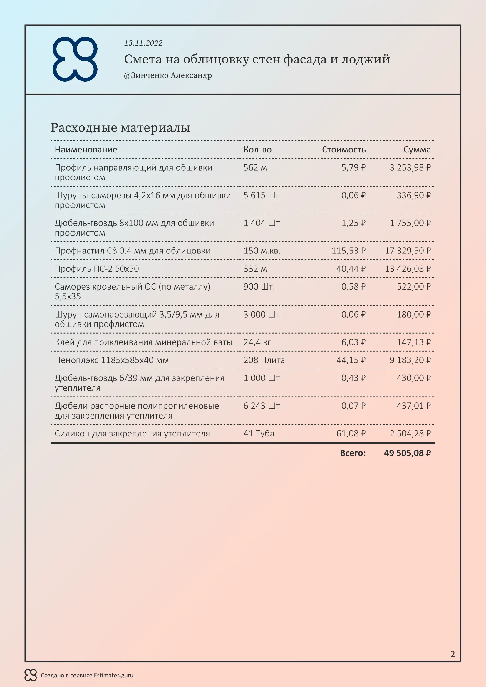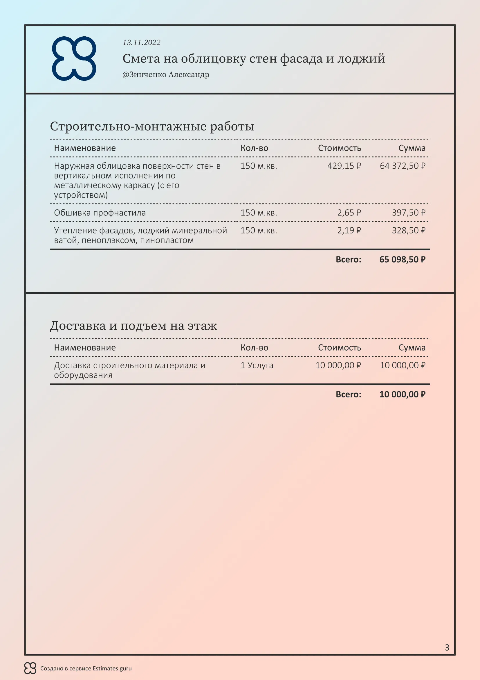 У шаблона гибкие настройки. Вы легко измените смету для своих целей. Загрузите в личный кабинет все материалы и услуги, укажите цены и отправьте клиенту готовый документ.