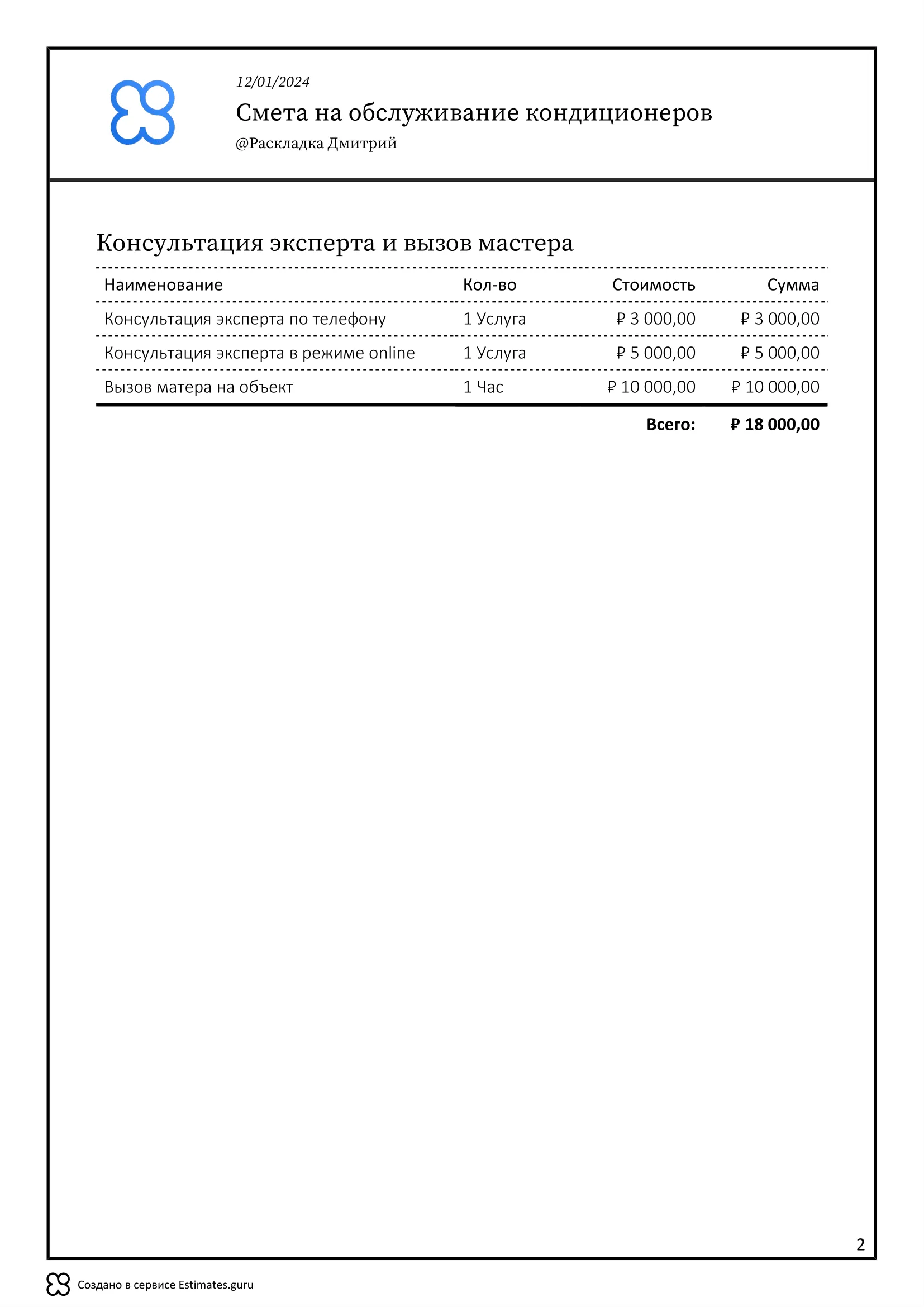 В онлайн сметы включены работы по техническому обслуживанию сплит систем, консультация эксперта и вызов мастера.