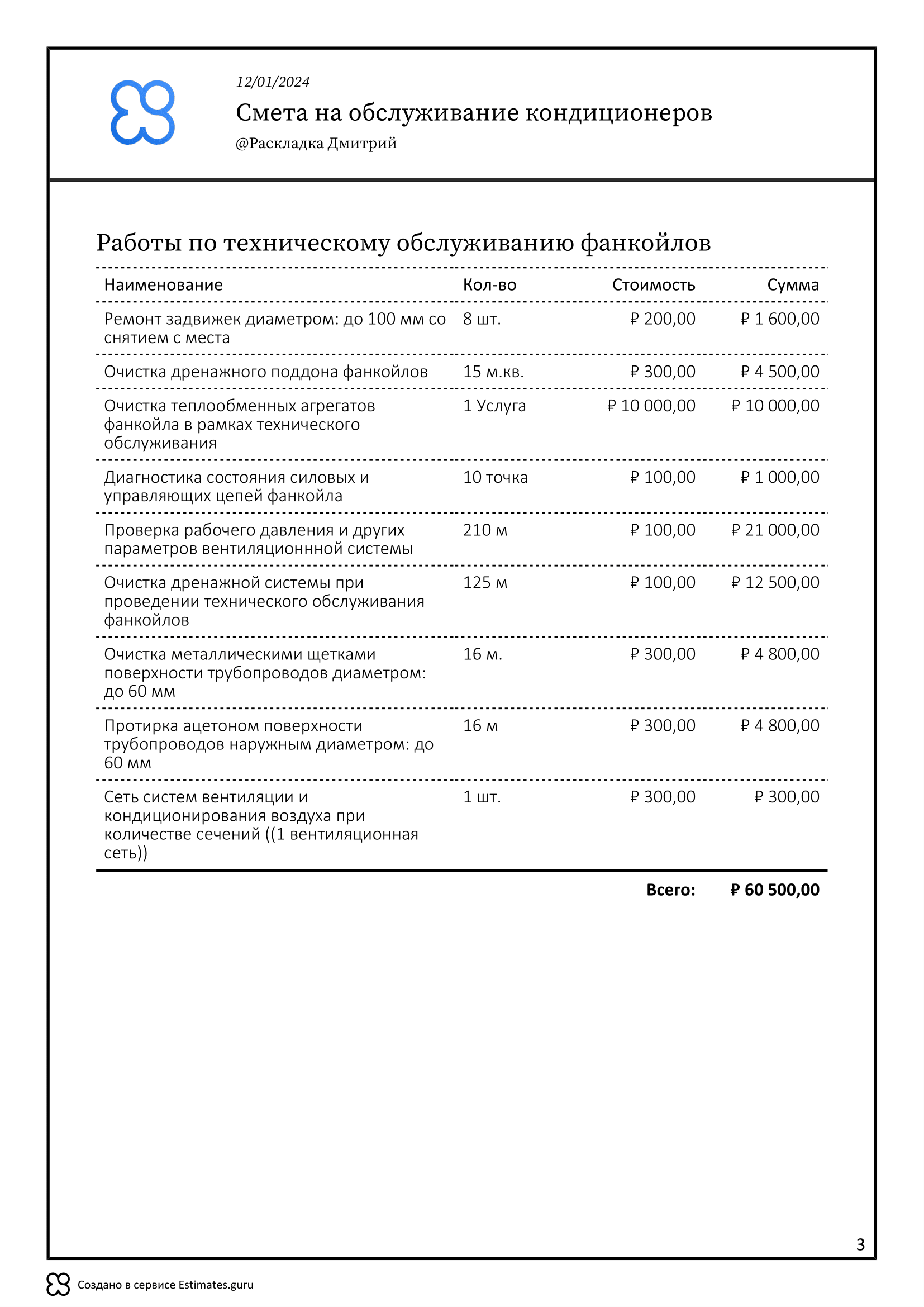 Шаблон сметы включает в себя услуги по обслуживанию систем кондиционирования, а смета, которую любой менеджер по продажам сможет дополнить актуальными цеными из своего прайс-листа, поможет ускорить подготовку коммерческих предложений.