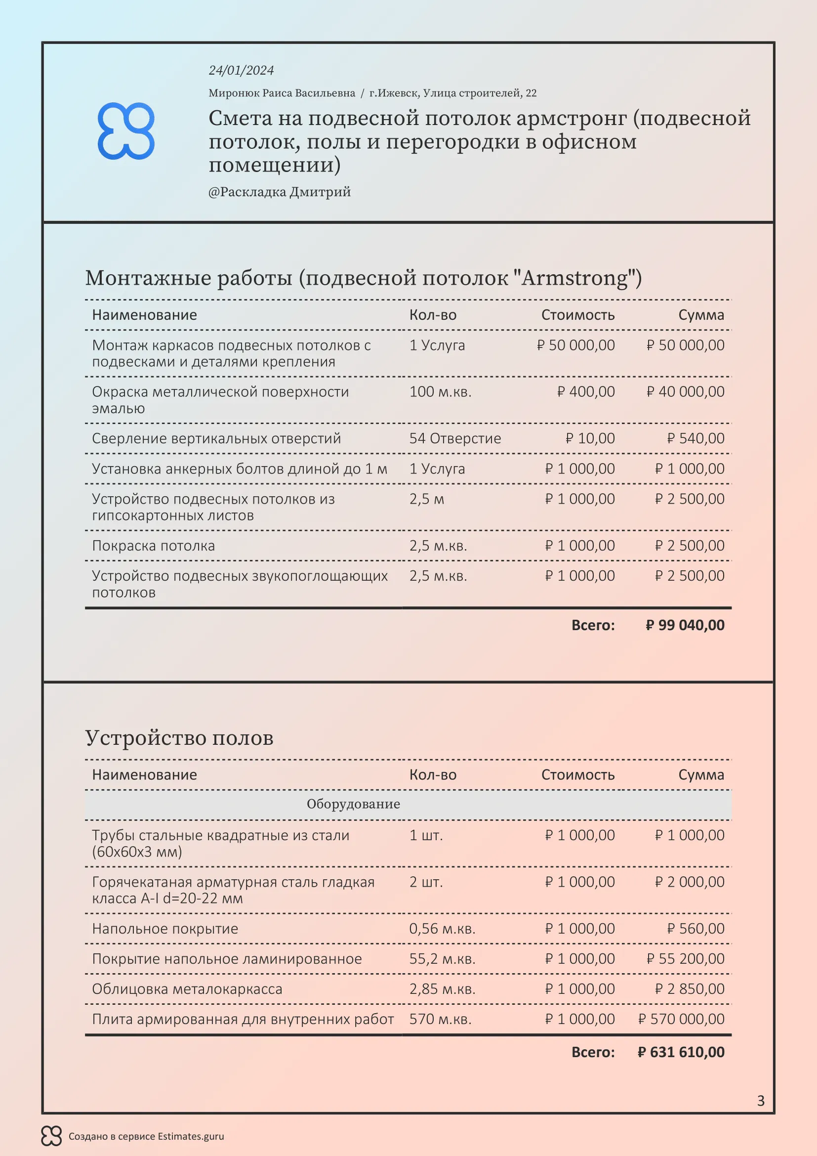 Смета на подвесной потолок армстронг (подвесной потолок, полы и перегородки в офисном помещении), включает цену на подвесной потолок, монтаж подвесного потолка, работы по полу и возведение перегородок в офисном помещении.