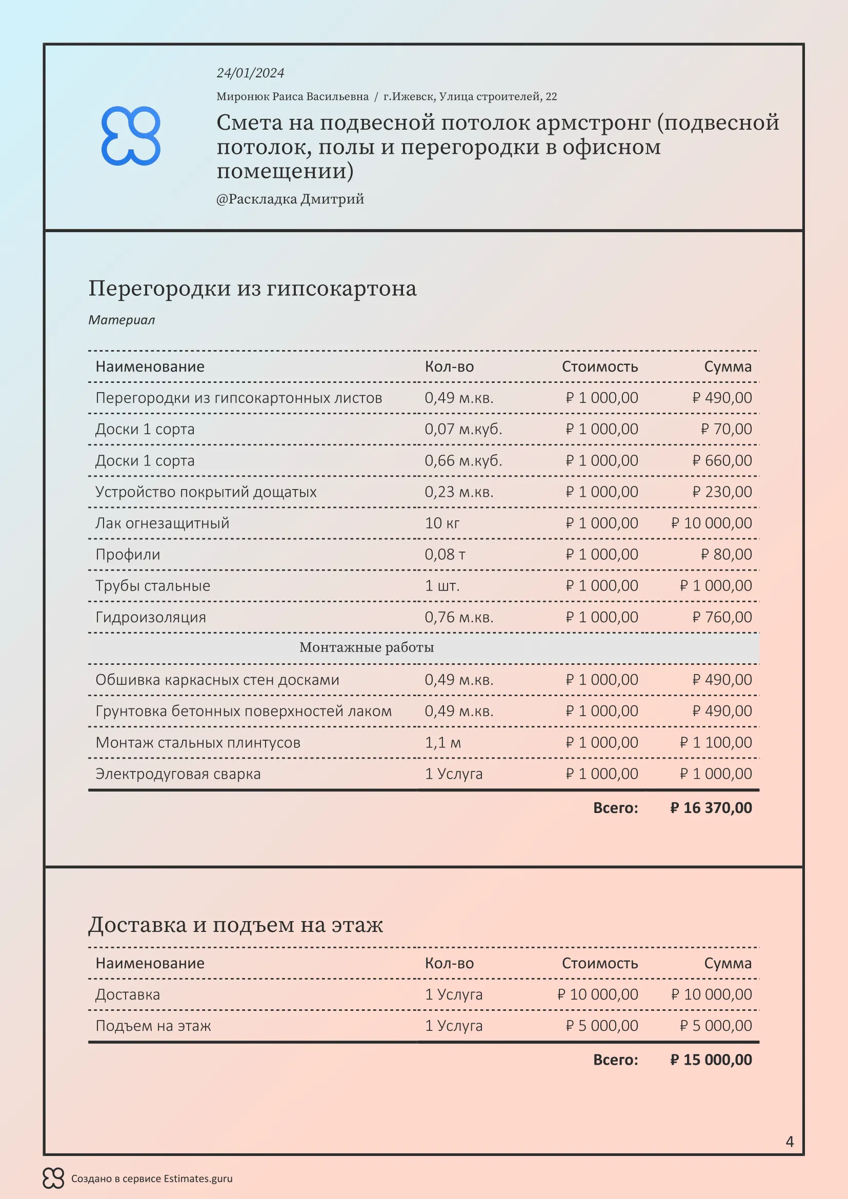 У шаблона гибкие настройки. Вы легко измените смету для своих целей. Загрузите в личный кабинет все материалы и услуги, укажите цены и отправьте клиенту готовый документ.