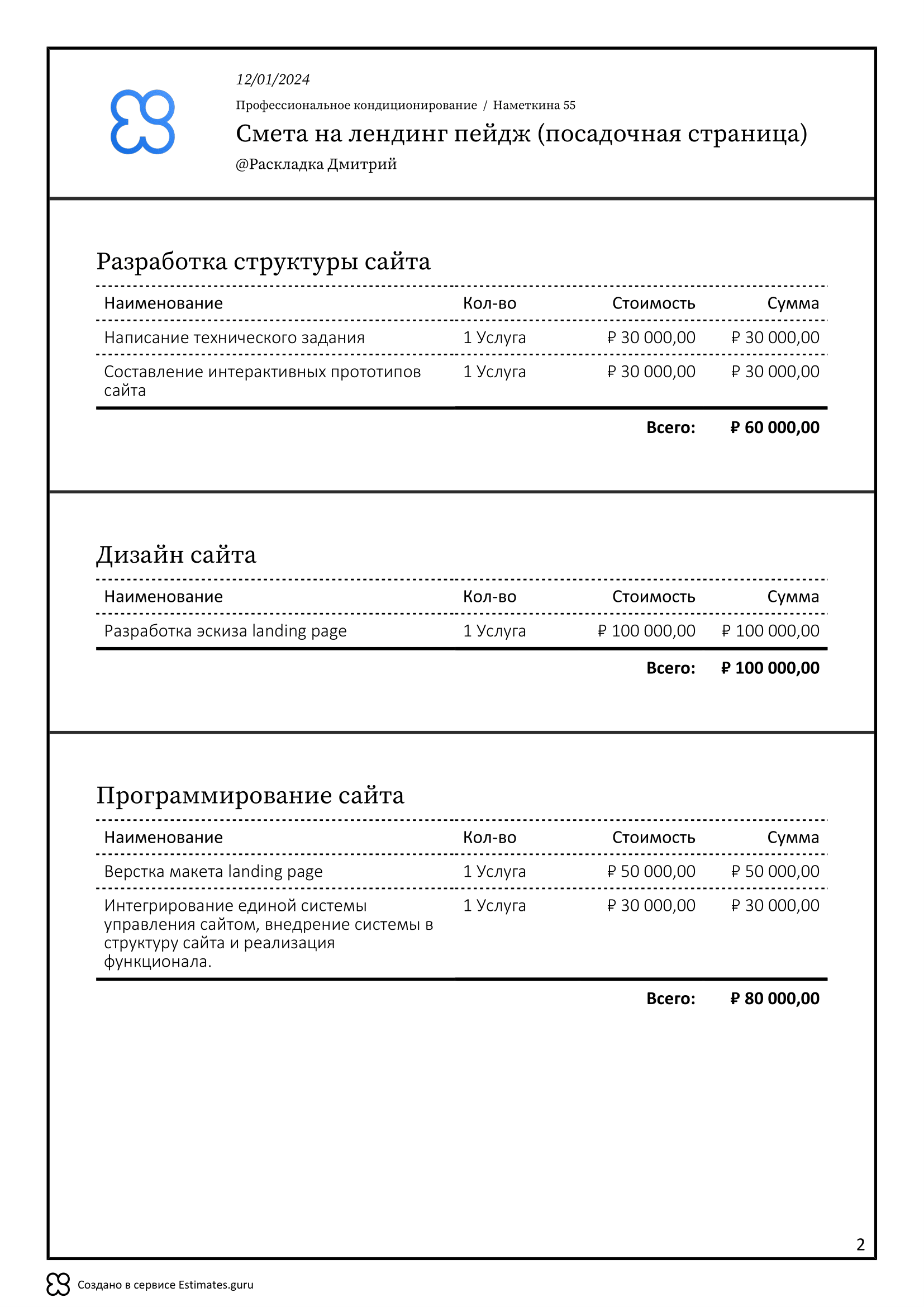 Смета на лендинг (посадочную страницу) поможет вашему отделу продаж готовить сотни коммерческих предложений, которые будут включать все необходимые этапы и работы: выбор административной системы управления сайтом, разработка дизайн макетов будущего сайта, верстка и программирование.