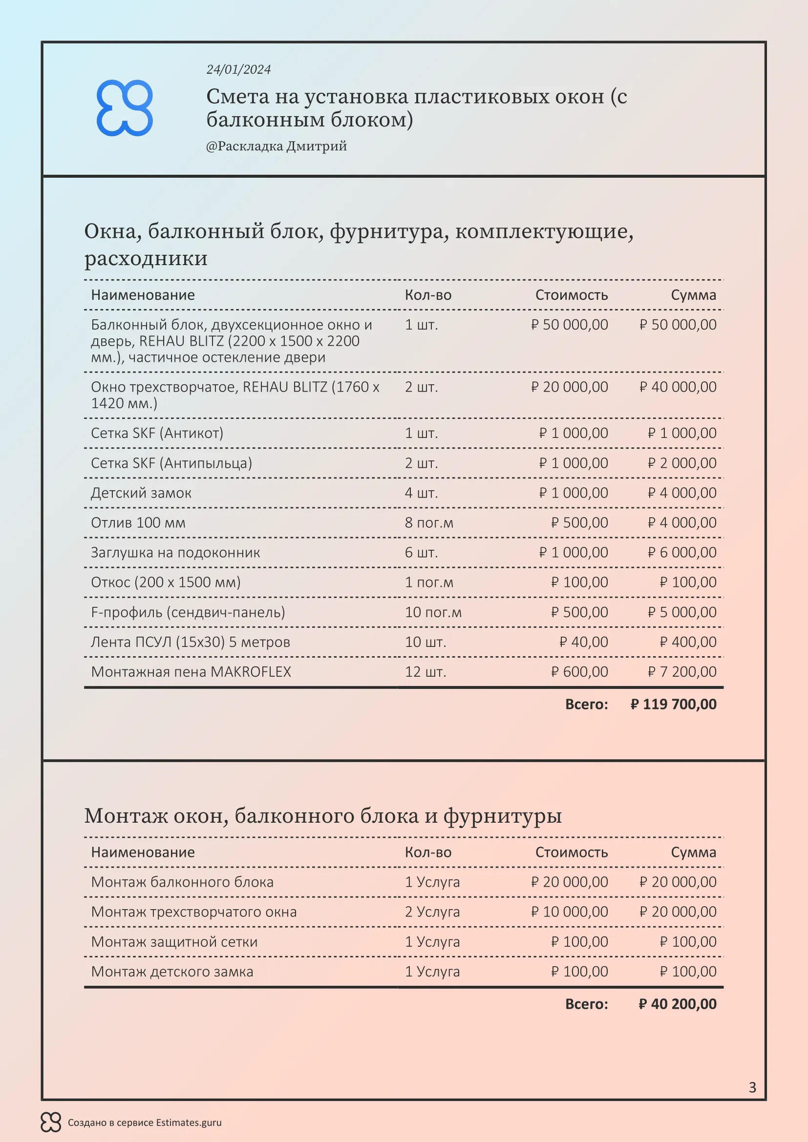 Рассчитанная смета на остекление всей квартиры, включая балконный блок с указанием оконного профиля, демонтаж и замену старого стеклопакета на современные пластиковые окна пвх с гарантией от производителя.