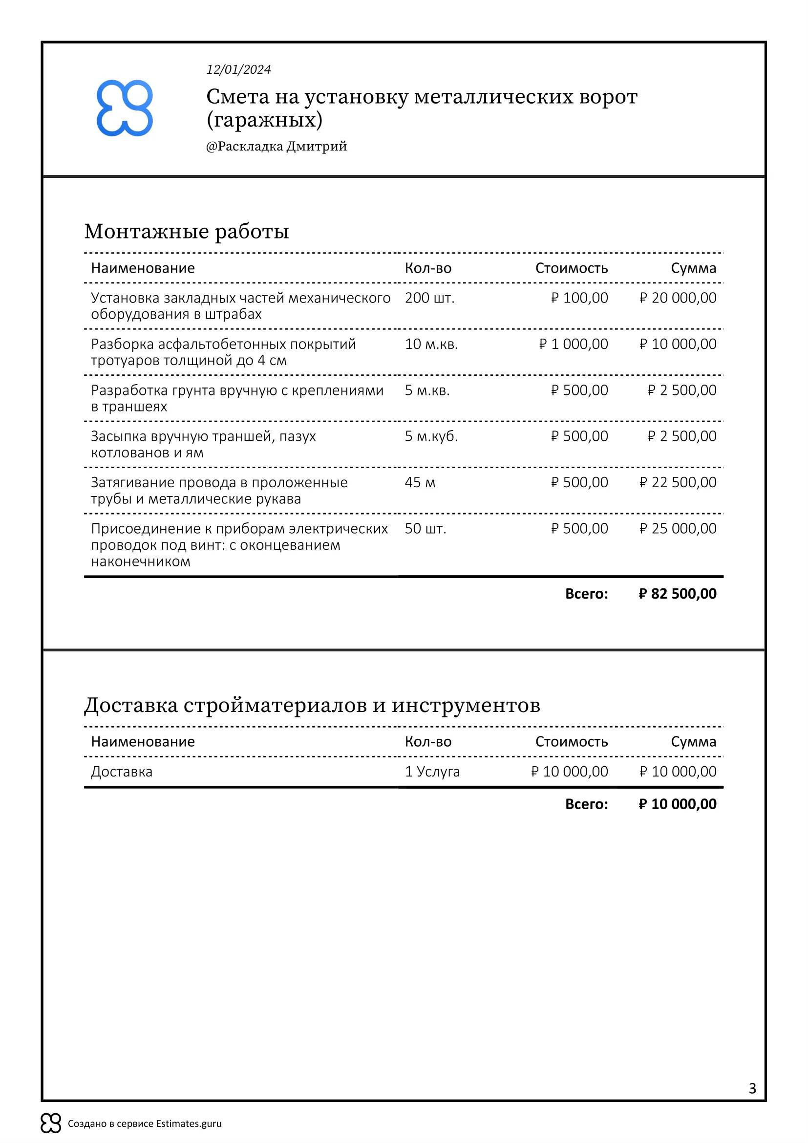 В смете указаны этапы связанные с подготовкой фундамента для металлических ворот, сама установка металлических ворот и все расходные материалы.