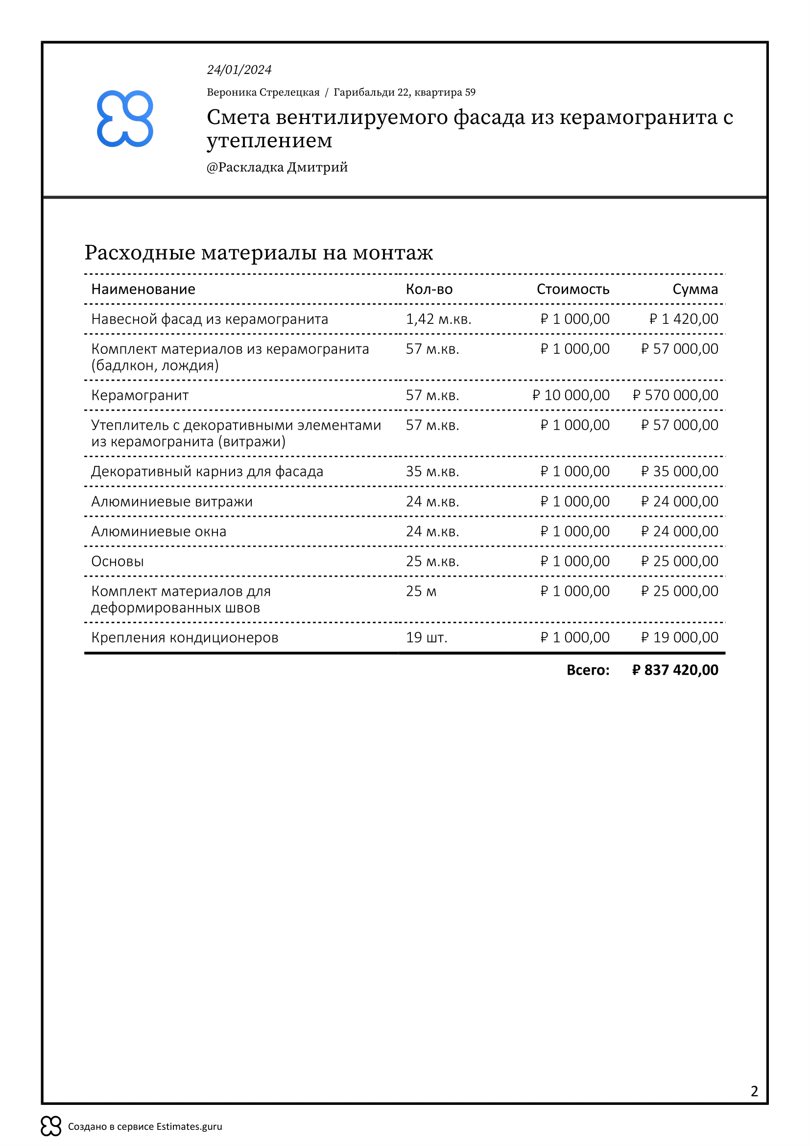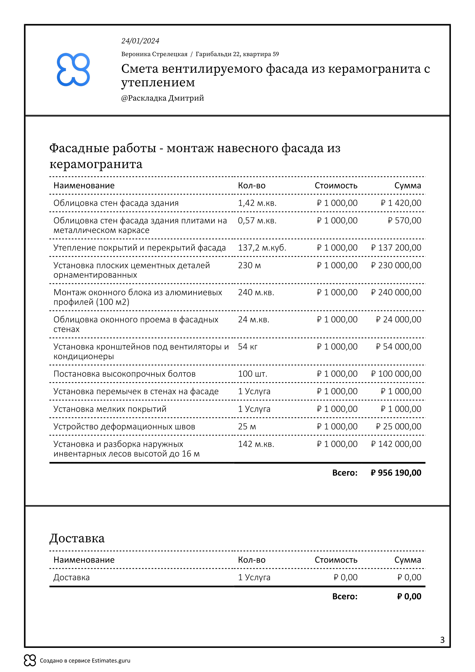 Дополните смету на вентилируемый фасад с утеплением актуальными ценами из своего прайс листа